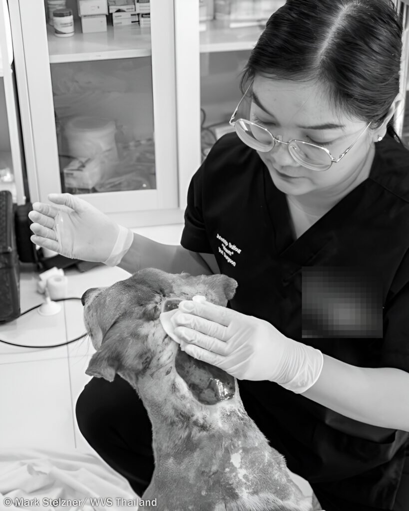 The hands in this photo are wearing medical gloves — not because we were afraid of Deny, but because we wanted to protect his open wounds from infection. This was the first time in a long time that someone touched Deny not to hurt him.